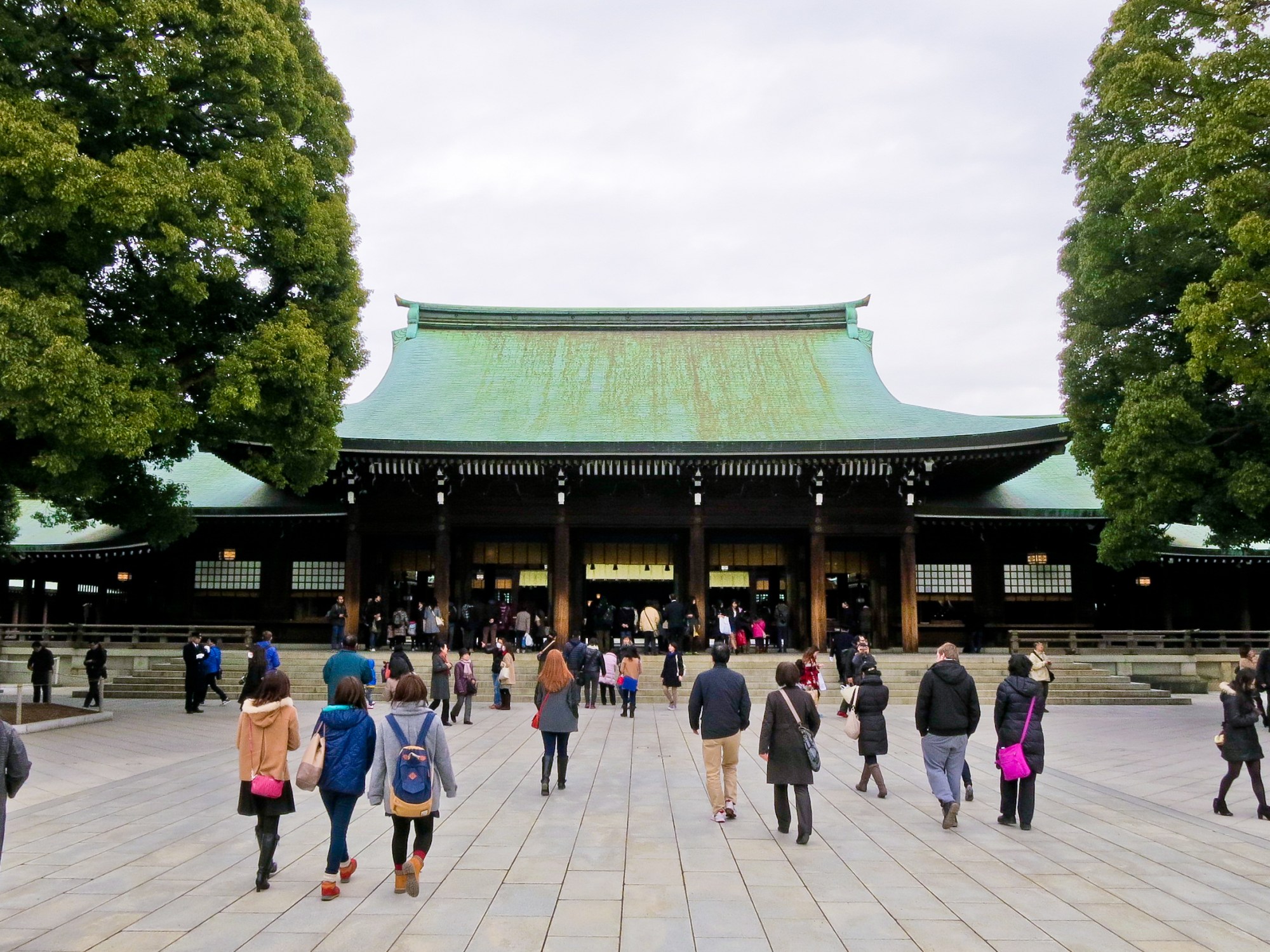 Danach war Kontrastprogramm fällig. Schon von der Aussichtsplattform ist mir der Yoyogi-Park ins Auge gestochen, der den Meiji-Schrein, Tokyos größten Shintō-Schrein, beheimatet. Dieser ist dem Herrscher Meiji gewidmet, welcher Japan während seiner Regierungszeit von 1867 bis 1912 Japan reformierte und den Grundstock des modernen Japans legte. Auch der Shintō-Glaube wurde unter seiner Herrschaft reformiert und zur offiziellen Staatsreligion gemacht. Shintō bedient sich alter japanischer Urmythen, des Buddhismus und Konfuzianismus und ist an keine Dogmen gebunden. Er richtet sich an eine Vielzahl japanischer Götter und verehrt auch den Tennō (japanischen Kaiser) als Glaubensgründer.